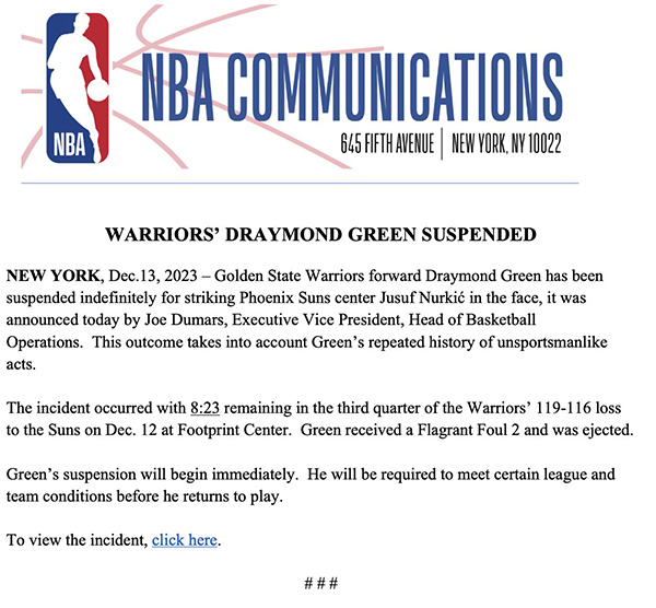 NBA官方声明:考虑到追梦过往屡次违法体育道德的行为,将会对他进行无限期禁赛,追梦的禁赛会立即执行,他需要满足联盟和球队的特定标准之后才能返回球场。