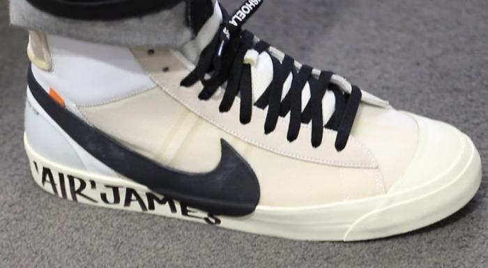 詹姆斯所穿运动鞋上印着“AIR JAMES”字样,还印着其他标语。
