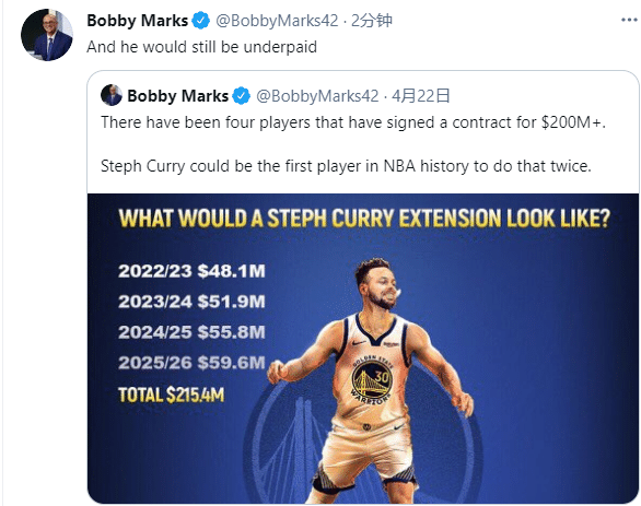 库里神级表现引热议,美媒《露天看台》发推写道:库里压哨,荒谬至极;名记则是转发库里可以和勇士续签4年2.15亿美元合同,发推写道:即使这样,这合同还是太少了。