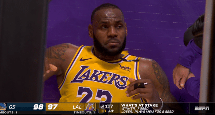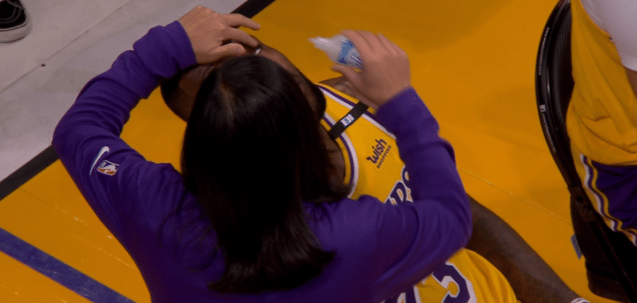 终场结束,詹姆斯左眼依旧不能完全睁开,当时湖人队医给他滴了一点滴眼液;赛后詹姆斯回应此次被格林犯规,他表示:我在比赛中花了很多时间,被格林的手指戳到眼睛后,我真的看到场上有三个篮筐。