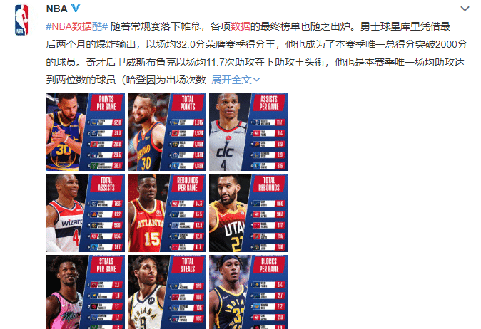联盟变天!七大数据王全部易主,库里威少成赢家,哈登詹皇无缘