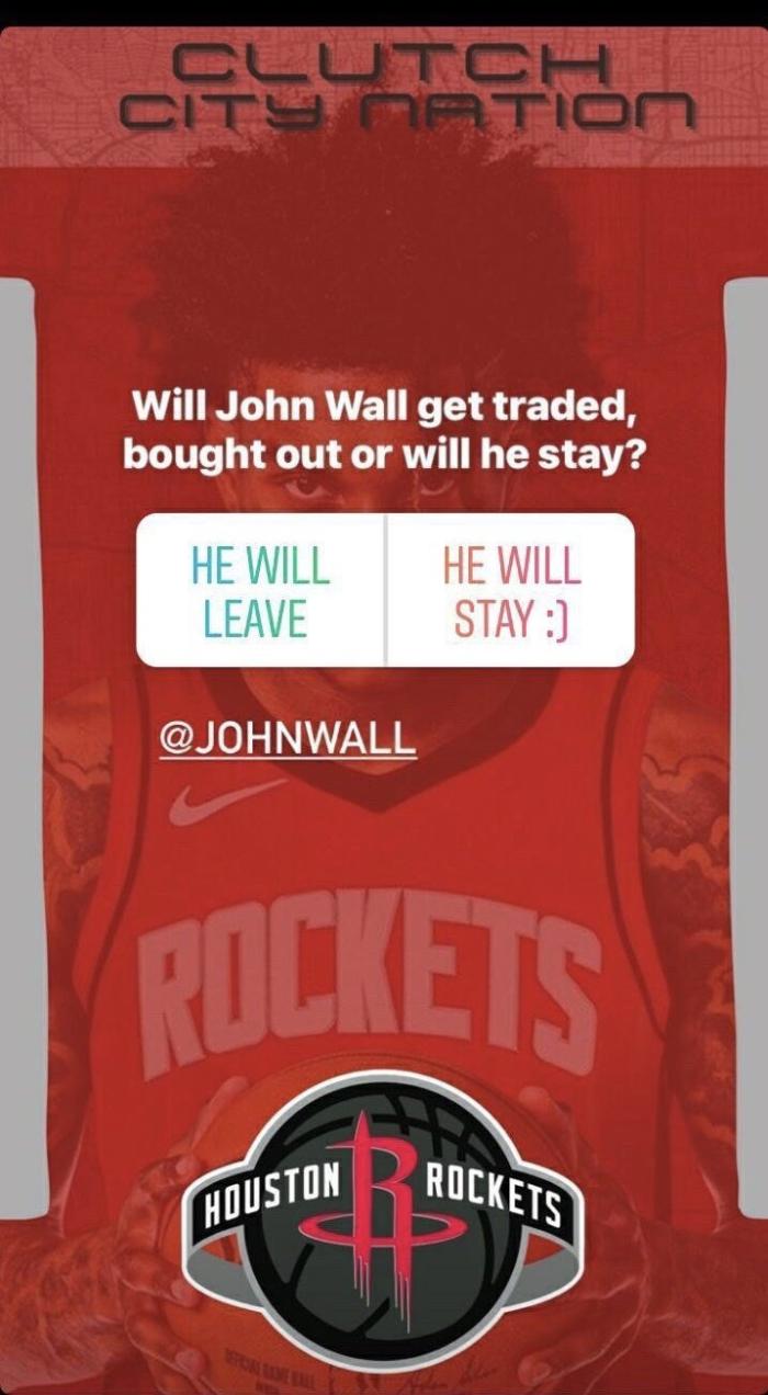 来源:JRS直播网05-16 15:01JRS直播网讯 北京时间5月16日,为Clutch City Nation的火箭媒体发起了一项投票,投票内容是:约翰-沃尔会被交易,买断还是会留下?