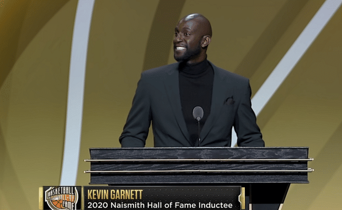 登台演讲之前是现场是一段回顾KG职业生涯的视频,随后加内特演讲,他感谢并恭喜了邓肯、科比:“能与二位一起进入名人堂是我的荣幸”;加内特感谢了一众前辈,其中就包括自己的引荐人。同时加内特感谢自己的家人,母亲、妻子和女儿。感谢波士顿、感谢老里弗斯、安吉等人以及队友,感激布鲁克林的一切。感谢喜欢以及嘲讽他的球迷。同时加内特也感激了明尼苏达,同时也遗憾自己没给那里带来一个冠军。在演讲最后,加内特祝福科比遗孀瓦妮莎。