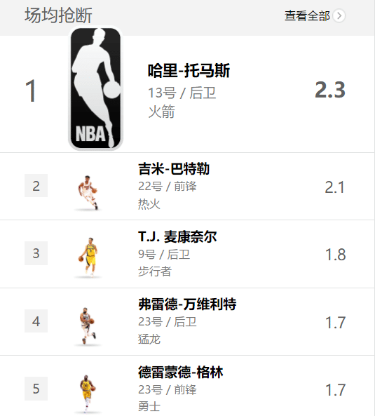 巴特勒场均2.1次抢断,力压麦康奈尔1.8次、场均1.7次的有范弗利特和追梦格林。巴特勒的防守一直都很好,他在这一数据上处于遥遥领先的位置,拿下联盟抢断王还是实至名归的。