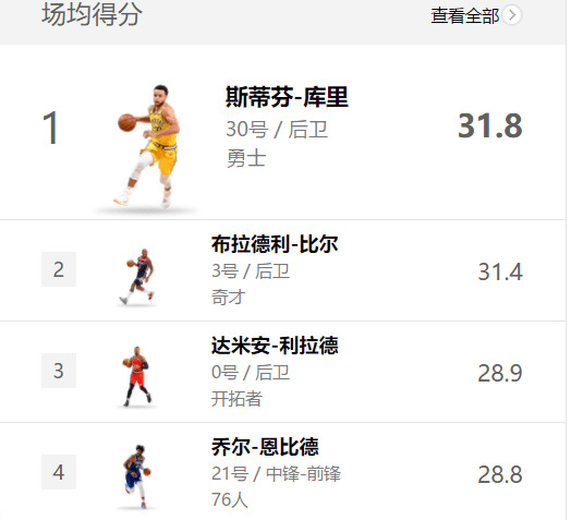 来源:JRS直播网05-14 19:59JRS直播网讯距离NBA常规赛结束只剩下3天的时间了,联盟30支球队也都只剩下1-2场比赛了。常规赛行将结束,本赛季数据王也接近出炉,翻看下数据榜单,其实各个单项数据王已经没有太多的悬念,比尔将继续缺阵,库里接近锁定得分王。巴特勒、特纳和卡佩拉也都有斩获。PS:球员必须满足常规赛出场70%,本赛季也就是得达到51场,才有评选标准。