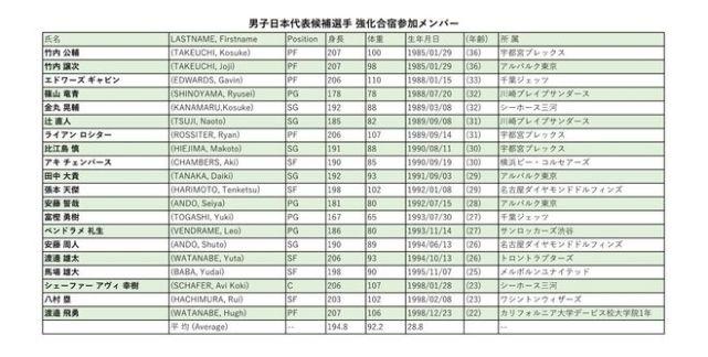 这份20人名单除了来自奇才的八村塁和来自猛龙的渡边雄太之外,其余球员包括:筱山龙青(川崎)、安藤誓哉(A东京)、富坚勇树(千叶)、bendrama礼生(SR涩谷)、金丸晃辅(三河)、辻直人(川崎)、比江岛慎(宇都宫)、田中大贵(A东京)、安藤周人(名古屋D)、张本天杰(横滨水手队)、马场雄大(墨尔本联队)、竹内公辅(宇都宫)、竹内让次(A东京)、edwards galvin(千叶)、rositerryan(宇都宫)、渡边飞勇(加利福尼亚大学戴维斯分校研究生院)