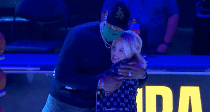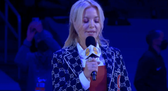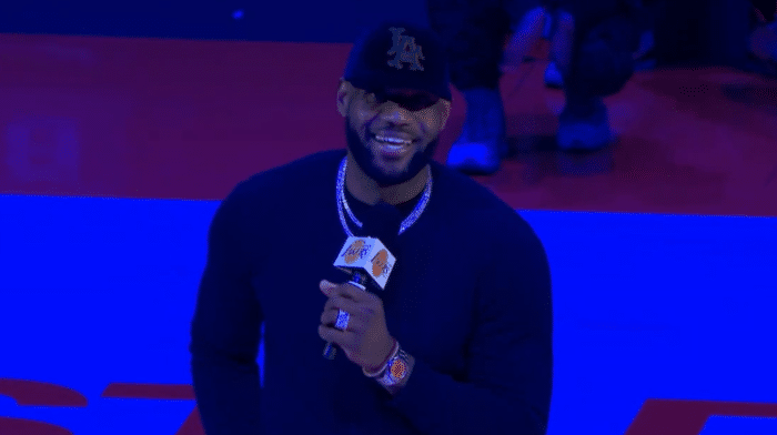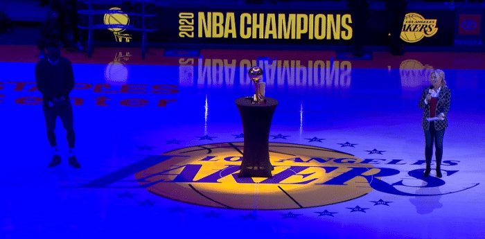 赛前湖人美女老板珍妮-巴斯发表演讲,2020年总冠军奥布莱恩杯就放在球场中央logo处,随后詹姆斯拿起话筒发表讲话,此时老詹咧嘴大笑,詹姆斯表示我曾经承诺过,我代表球队来到这儿,我们要把这个献给你们(球迷),我们已经拿到戒指,但在没有球迷入场之前,我们不会揭晓总冠军旗帜,接下来我们一起见证。