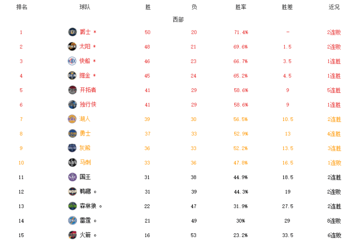 西部1-8名:爵士、太阳、快船、掘金、开拓者、独行侠、湖人、勇士;