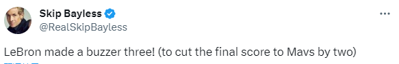 末节詹姆斯带队与独行侠僵持,可东契奇带队一直保持领先,艾克萨姆接连命中三分球扮演奇兵;关键时刻,詹眉频频打铁,终场前52秒艾克萨姆一记三分几乎杀死比赛,最后2.4秒湖人落后5分,独行侠换下主力,詹姆斯命中压哨三分,终场哨响比赛结束,湖人2分惜败;赛后詹姆斯压哨三分引争议,著名詹黑Skip表示:勒布朗命中压哨三分(把最终分差缩小到2分)。