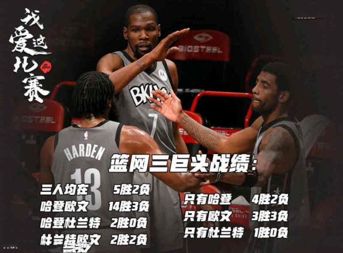 根据统计,杜兰特、欧文、哈登的篮网三巨头自从走在一起后,他们一起一共打了7场比赛,一共同时在场186分钟,这7场比赛,篮网队的战绩是5胜2负,值得一提的是,三人一起首发的六场,他们的战绩是5胜1负。