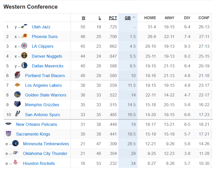 来源:JRS直播网05-11 15:53JRS直播网讯 北京时间5月11日,NBA常规赛结束多场争夺,西部季后赛争夺战有了新的局面。勇士爆冷击败爵士,守住第8的位置,灰熊和马刺赢球,鹈鹕争夺附加赛资格希望渺茫。开拓者击败火箭,取得4连胜,他们再次拉开和湖人的差距,不过未来他们面临3场硬仗,湖人依然有机会追赶。