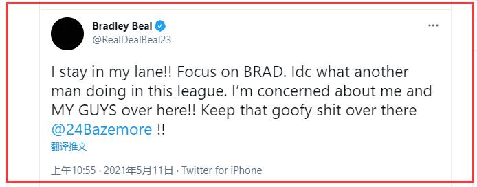 比尔在社交媒体上连发两条推文,爆粗怒怼贝兹莫尔,他先是@ 了贝兹莫尔并写道:“你T-M根本不了解我,你根本不知道我为何会在场上打球,我根本不用和另一个人去比较,来证明什么,你的说法是站不住脚的。但是我对你的言论并不惊讶,因为这就是你这种人说话的风格!”