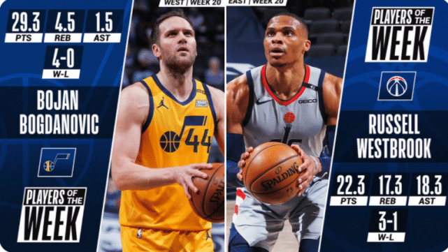 来源:JRS直播网05-11 10:29JRS直播网讯 北京时间5月11日,NBA官方宣布了上周的周最佳球员。东部周最佳属于奇才后卫拉塞尔-韦斯布鲁克,西部周最佳则由爵士前锋博扬-博格达诺维奇当选。