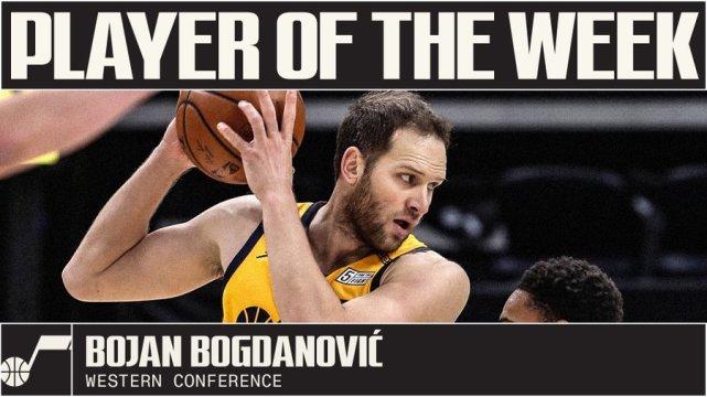 过去一周,博格达诺维奇场均贡献29.3分4.5篮板1.5助攻,投篮命中率62.3%,三分命中率53.8%,帮助爵士取得4胜0负的佳绩。这是博格达诺维奇生涯第二次获得周最佳的荣誉,他在2019年2月曾经拿到过一次周最佳。