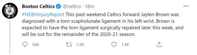 来源:JRS直播网05-11 10:25JRS直播网讯 北京时间5月11日,凯尔特人官方宣布,前锋杰伦-布朗被诊断出左手腕舟月韧带撕裂,预计将在本周晚些时候接受手术治疗,已经确定缺席2020-21赛季余下的所有比赛。布朗的赛季报销,对凯尔特人而言,无疑是一次沉重的打击!