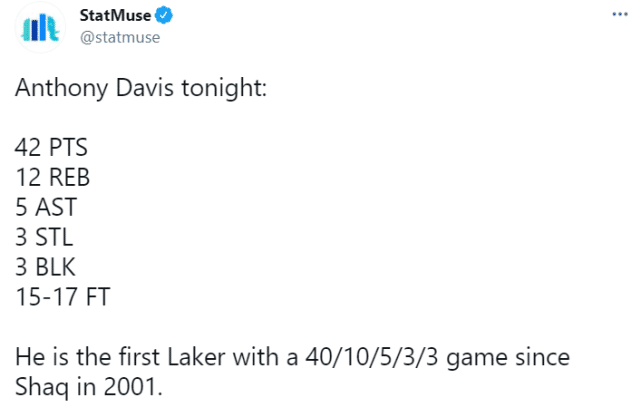 StatMuse数据显示, 浓眉是2001年的奥尼尔之后第一个打出40+10+5+3+3的湖人球员。毫无疑问,这是一场属于浓眉的比赛。而一向被称为“头号詹黑”的名嘴斯基普-贝勒斯,再次把矛头对准浓眉的队友詹姆斯。