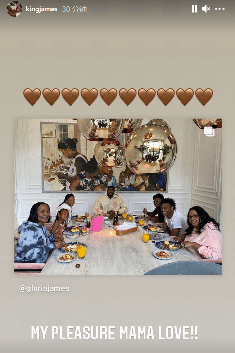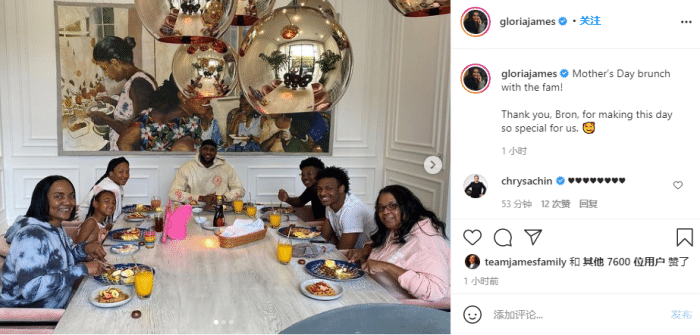 格洛里亚感谢詹姆斯组织聚餐,更新动态Ins,晒出全家福并且写道:在母亲节这一天,和全家一起吃饭,谢谢你,勒布朗,让这一天对我们如此特别。