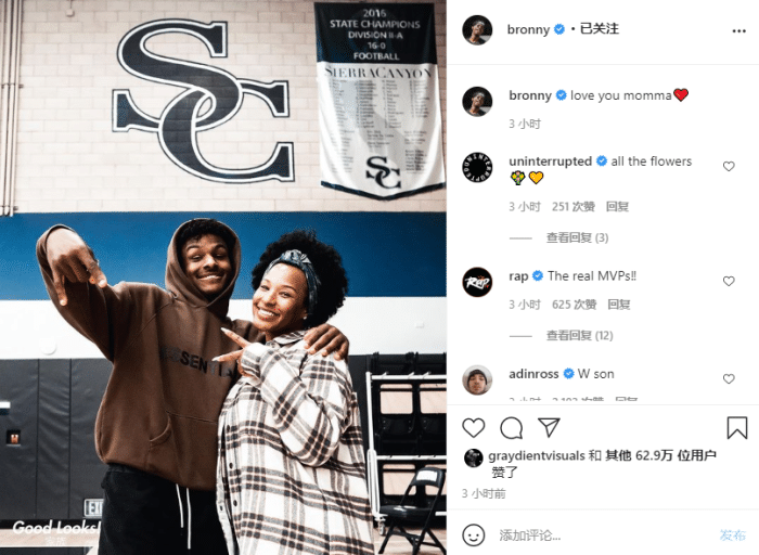 詹姆斯大儿子布朗尼晒出和自己母亲的合影,写道:爱你,妈妈!