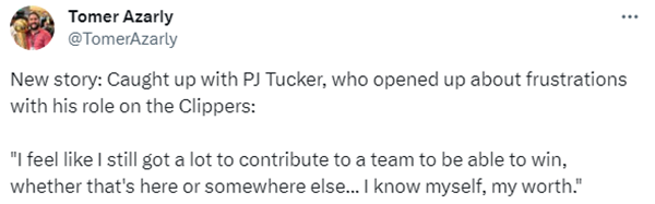 据名记shams报道,塔克对他在快船的现状感到沮丧,双方正在讨论如何解决他在球队或者其他地方的角色问题;接受快船记者Tomer Azarly接受时,塔克公开表态希望去别的球队帮忙。