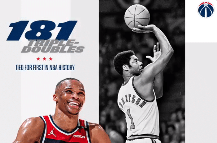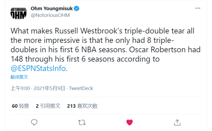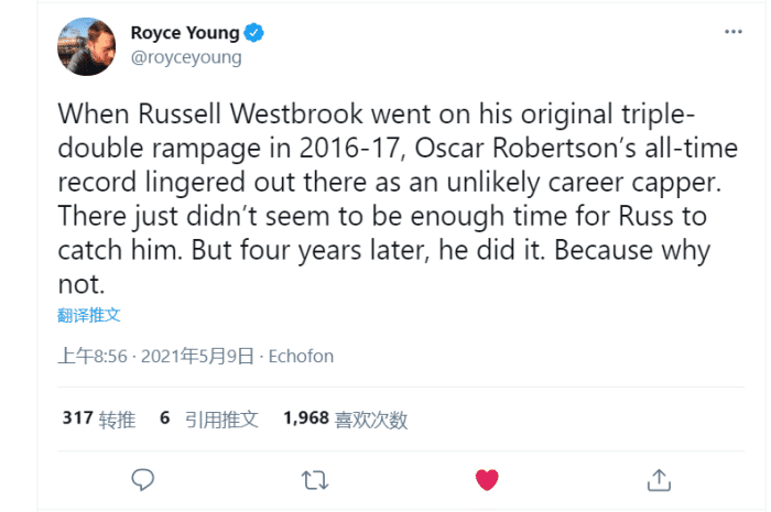 名记royce young:当韦少在2016-17赛季开始三双之旅时,当时罗伯特森的三双纪录那么遥不可及,看上去韦少并没有足够的时间去追赶大O。但仅仅4年之后,他就做到了,为什么不呢!(韦少座右铭why not)
