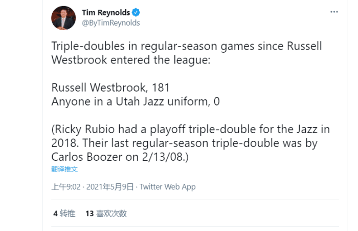 据记者tim统计,韦少从08年进入NBA到现在常规赛一共181次砍下三双,而这期间爵士球员拿到三双的次数为0!卢比奥在2018年季后赛曾拿到三双,爵士上一位在常规赛拿到三双的是08年2月13日的布泽尔,不过那时神龟还没有被雷霆选中。