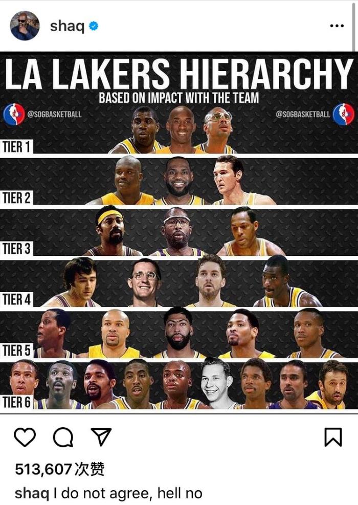 来源:JRS直播网05-09 15:07JRS直播网讯 北京时间5月9日,前湖人名宿奥尼尔在社媒上晒出了一张由媒体制作的湖人队史球员分档图,分档基于他们的荣誉、带队能力、影响力等多个因素,奥尼尔附文“我不同意,绝不。”