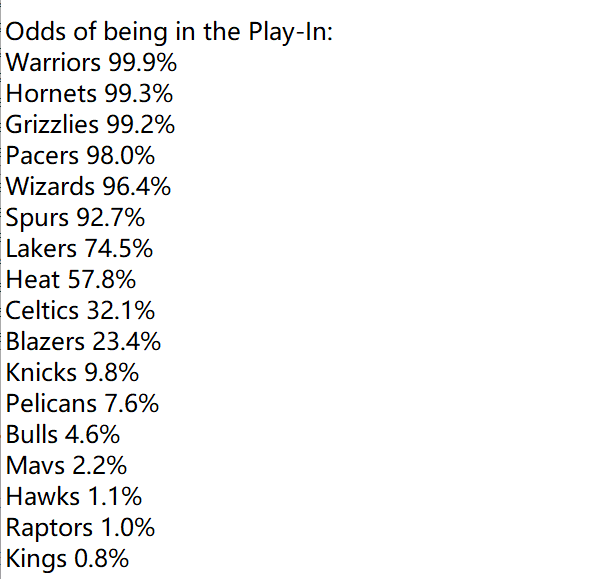 第1-10位:1.勇士(99.9%)、2.黄蜂(99.3%)、3.灰熊(99.2%)、4.步行者(98.0%)、5.奇才(96.4%)、6.马刺(92.7%)、7.湖人(74.5%)、8.热火(57.8%)、9.凯尔特人(32.1%)、10.开拓者(23.4%);