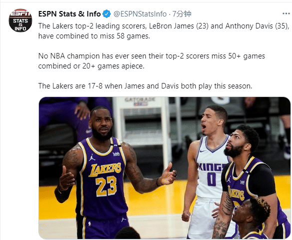 据统计,詹姆斯和浓眉都出战时,湖人战绩17胜8负,由于遭遇伤病,湖人两大巨头总共缺席58场比赛。