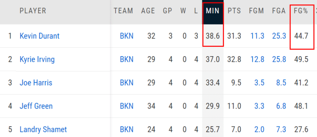 其一,纳什过于依赖杜兰特和欧文,4连败期间,两人的出场时间明显增加。刚刚复出的杜兰特打了其中3场,场均出场时间高达38.6分钟, 排名全队之首。纳什真的不怕吗?虽说杜兰特的得分数据也随之提升,但他的命中率明显下滑,从53.8%变成44.7%,跌了快10个百分点。杜兰特的体能明显跟不上了,对独行侠一战,杜兰特下半场只有10投1中的表现。欧文的命中率也有所下滑,只不过没有杜兰特那么明显。