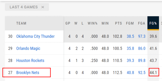 来源:JRS直播网05-07 19:29JRS直播网讯 北京时间5月7日,篮网109-113不敌独行侠,遭遇4连败。篮网究竟怎么了?数据显示,4连败期间,篮网的多项数据排名暴跌,特别是投篮命中率。4连败之前,篮网投篮命中率49.1%,排名联盟第1位,而4连败期间,篮网投篮命中率只有44.1%,排名联盟第27位,只比火箭、魔术和雷霆强。