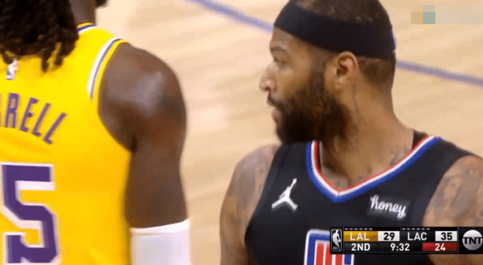 整个上半场,30岁考辛斯打出统治力,上来就在内线顶着哈雷尔的防守把球打进,随后两次得分也是对位哈雷尔,禁区持球背打哈雷尔,面对包夹仍旧上篮得分;第二节中段,考辛斯外线出手投进空位三分,然后两分球再进,连得5分打停湖人。