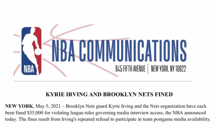 官宣重罚7万美元!欧文违规又牵连篮网被罚,真因曝光:多次拒绝采访 追球者 原创 5小时前