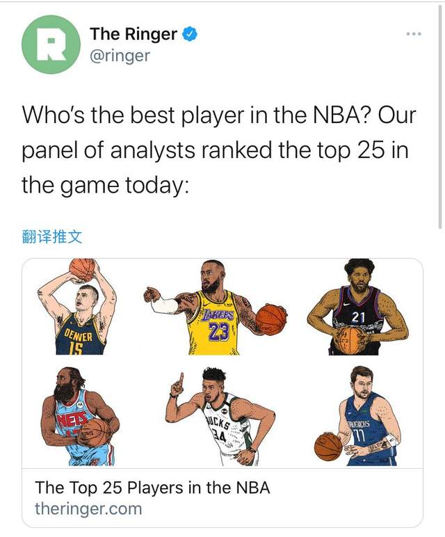 来源:JRS直播网05-05 20:35JRS直播网讯这两年的NBA经历了历史上最特殊的情况,球员们在封闭赛区打了一整年的常规赛,时至今日才刚刚欢迎球迷入场观看比赛。而这种封闭园区的比赛模式很考验球员们的耐心,因此本赛季的联盟格局也出现了不小的改变。根据本赛季各位球星的表现,一家美国媒体就评选出了一份榜单,上面给出了他们认为的NBA本赛季前25大球星,那么下面就让我们来看看这份榜单到底如何。
