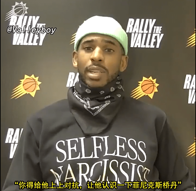 赛后保罗戴着小绿帽接受采访“大多数人都会说米卡尔是个很好的家伙,但看到他在加时赛如此怒气冲冲,真是感觉不一样,他是我们本场赢球的关键。你知道的,他通常不这么愤怒,有几场球我累了,我会对他说‘嘿,你得把这些家伙防住,你得给他上对抗,让他认识一下菲尼克斯桥丹’当他如此发挥时我就赢定了”