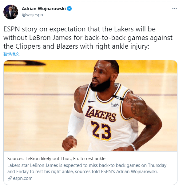 来源:JRS直播网05-05 20:12JRS直播网讯北京时间5月5日,ESPN名记沃纳罗斯基报道,预计詹姆斯将会因右脚踝伤势再缺席两场比赛,缺席对阵快船和开拓者的背靠背比赛,从而继续休养右脚踝;名记还表示随着季后赛临近,湖人谨慎对待詹姆斯的脚踝伤病,甚至爆料詹姆斯可能会缺席更多的比赛。
