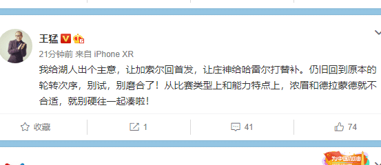就在今天知名篮球人王猛给出自己的建议,他认为湖人花大力气已经的庄神和原本的阵容不合拍,称:“我给湖人出个主意,让加索尔回首发,让庄神给哈雷尔打替补。仍旧回到原本的轮转次序,别试,别磨合了!从比赛类型上和能力特点上,浓眉和德拉蒙德就不合适,就别硬往一起凑啦!”