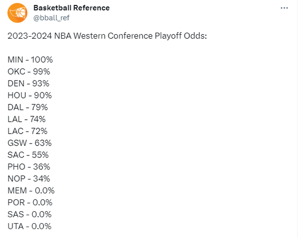 西部——森林狼100%;雷霆99%;掘金93%;火箭90%;独行侠79%;湖人74%;快船72%;勇士63%;国王55%;太阳36%;鹈鹕34%;灰熊、开拓者、马刺和爵士0%。