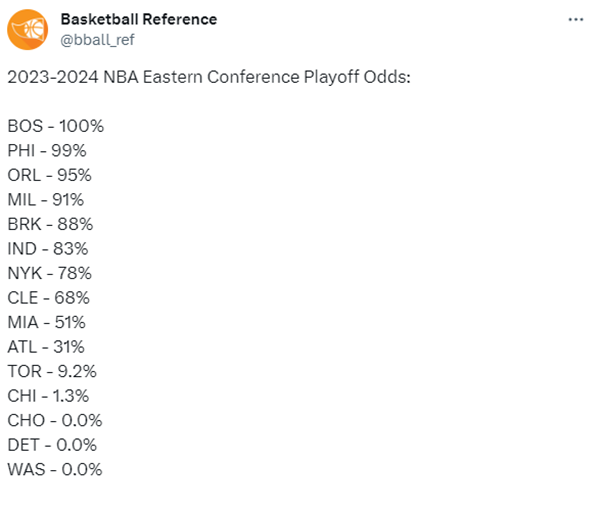 东部——凯尔特人100%;76人99%;魔术95%;雄鹿91%;篮网88%;步行者83%;尼克斯78%;骑士68%;热火-51%;老鹰31%;猛龙9.2%;公牛1.3%;黄蜂、活塞和奇才0%。
