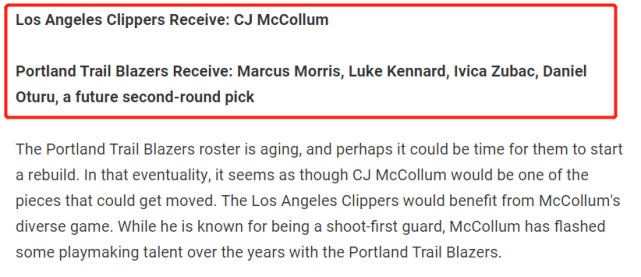 《fadeawayworld》给出了交易方案,快船队需要送出小莫里斯、肯纳德、祖巴茨、奥图鲁、以及未来的次轮选秀权,以五换一的交易方案就可以交易得到麦科勒姆。开拓者队若是还是不能在季后赛更进一步,他们就必须拆散双枪重组,小莫里斯、祖巴茨等多个球员或许可以帮助利拉德进入季后赛,但是他们也可以因此重建。而对于快船队来说,虽然送走了多个球员,但是他们可以保留莱昂纳德和乔治的核心,加上麦科勒姆,或许还可以续约伊巴卡等球员,他们下个赛季依然可以冲击总冠军。