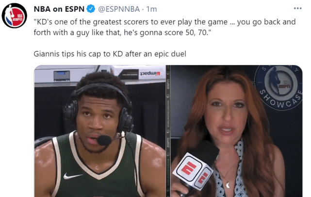 他可以拿下70分!字母哥赛后致敬杜兰特:史上最伟大的得分手之一