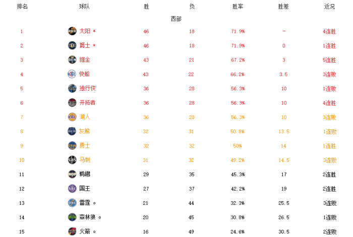 西部1-8名:太阳、爵士、掘金、快船、独行侠、开拓者、湖人、灰熊;