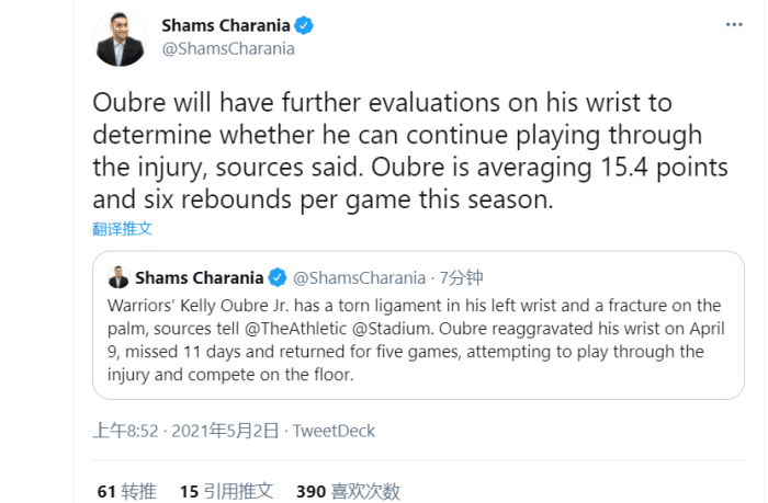 来源:JRS直播网05-02 18:40JRS直播网讯北京时间5月2日,勇士客场挑战火箭,乌布雷连续第二场缺席,名记shams报道,原来乌布雷遭遇了手腕韧带撕裂和手掌骨折两大伤病!值得一提的是,乌布雷在4月9日就加重了手腕伤势,随后缺席了11天时间,复出后打了5场比赛,他试图克服伤病带伤作战,但今天对阵火箭乌布雷再次缺席。shams跟进报道,乌布雷将对他的手腕伤势进行进一步的评估,看看能否带伤出战。赛季至今乌布雷场均可以送出15.4分6个篮板,是勇士主力球员之一,如果乌布雷因为这次受伤导致常规赛报销,那这对于球队来说无疑是一个不小的打击!