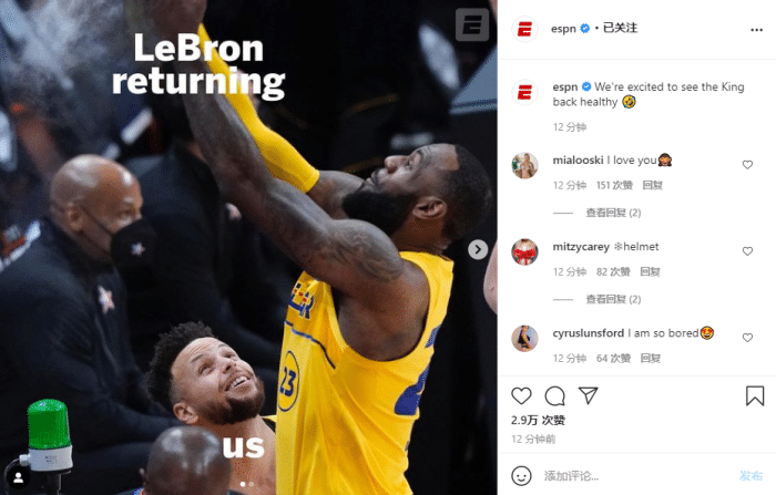 詹姆斯正式复出引热议,NBA官方晒詹姆斯训练画面,也宣布詹姆斯复出,众美媒纷纷转发这一重磅消息,权威美媒ESPN更新社交媒体,写道:我们很兴奋看到詹姆斯健康回归。