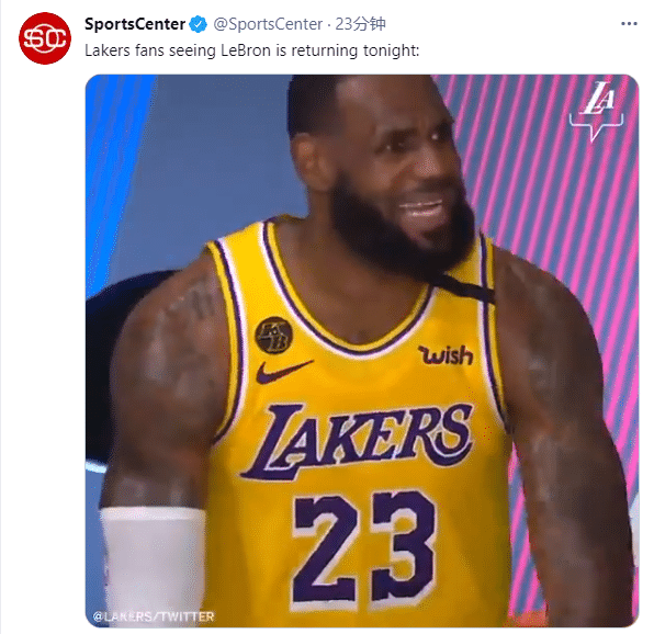 Sports Center发推晒出詹姆斯在场边挥毛巾疯狂庆祝的画面,写道:湖人球迷看到詹姆斯今天复出的心情。