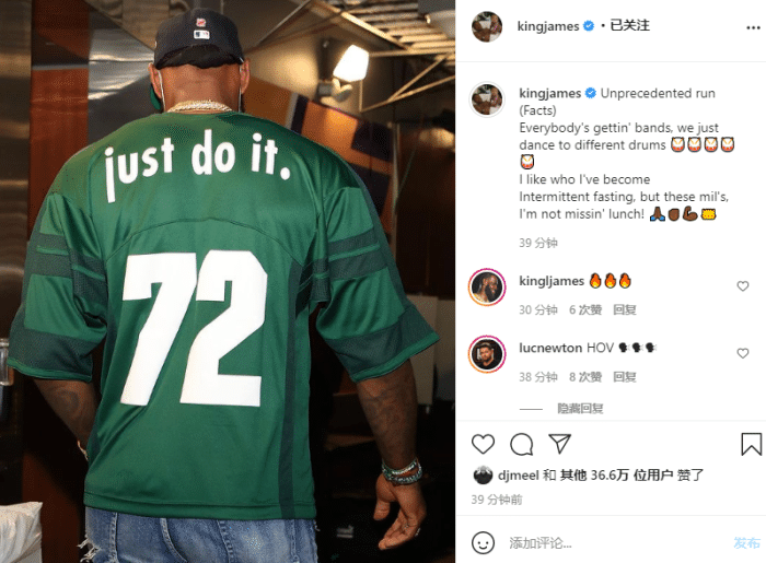 詹姆斯本人也更新社交媒体,晒出今日霸气入场照,上衣背后写着:JUET DO IT;还写道:每个人都要自己的乐队,我们只是跟着不同的节奏跳舞,我喜欢自己现在的样子,断断续续地禁食,但必吃每顿午餐。