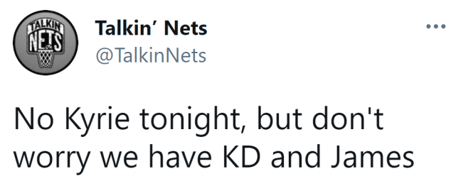欧文的缺阵,意味着篮网三巨头里又只有杜兰特一人带队上场了。篮网媒体Talkin'Nets倒是很乐观,写道:“今晚没有凯里(欧文),但别担心,我们有KD(杜兰特)和詹姆斯。”