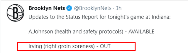 来源:JRS直播网04-30 17:47JRS直播网讯北京时间4月30日,篮网客场对阵步行者。赛前,篮网官方更新了伤病名单,欧文因右腹股沟酸痛缺席本场比赛,此前因健康安全协议休战的阿利兹-约翰逊已经可以回归。另外,布朗、克拉克斯顿、哈登、齐奥扎和丁威迪也不会在这场比赛中上场。