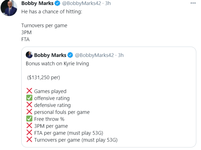 算上对步行者的比赛,欧文本赛季已缺席17场比赛,薪金专家鲍比-马克斯列出了欧文合同里的8项奖金激励条款(每项价值131250美元),以目前情况来看,6项暂时没有符合条件,它们分别是出战场数、防守效率、场均犯规、场均三分命中数,场均罚球次数、场均失误次数;已有2项符合要求(进攻效率、罚球命中率)。马克斯表示欧文在场均失误、场均三分命中数,场均罚球次数方面还有希望激活。