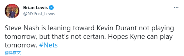 目前篮网已经提前锁定季后赛,纳什已经开始安排球星轮休,欧文腹股沟酸痛而休战,这就是篮网的轮休策略;由于篮网要打背靠背比赛,欧文今天不打,杜兰特则很可能明天不打,纳什已经明确表示,希望欧文下一场复出,计划轮休杜兰特。