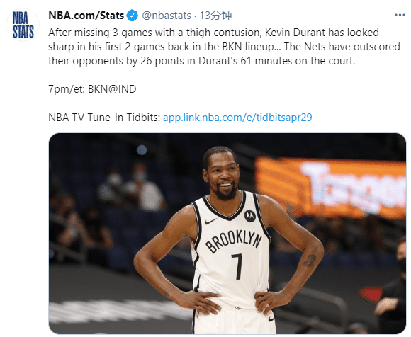 篮网三巨头仅剩杜兰特,不过伤愈复出后杜兰特太狠,据统计,在经历大腿挫伤缺席3场后,杜兰特本次伤愈回归连续出战两场,上场61分钟篮网净胜对手26分——对阵太阳替补轰下33分6板4助1断2帽,正负值+15,对阵猛龙7投5中轰下17分10板4助2帽2断(正负值+11)。
